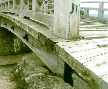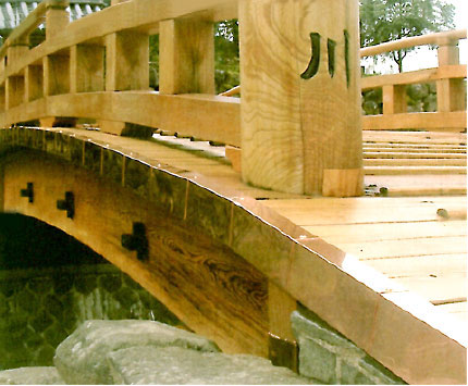 兵庫県豊岡市・出石城登城橋。紫外線や風雨により表面の劣化が進み、白木の美しさが失われていました。また、重歩道によるササクレやトゲなども目立ちます。